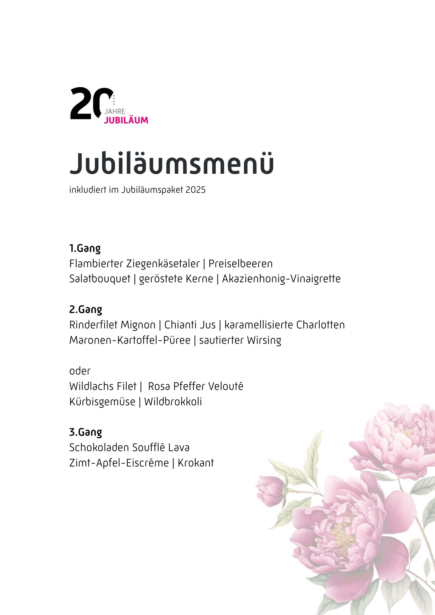 anlässlich unseres 20. Jubiläums haben wir etwas ganz Besonderes für Sie vorbereitet! Feiern Sie mit uns und genießen Sie unser exklusives Jubiläums-Paket, das wir mit viel Liebe zum Detail für Sie zusammengestellt haben.